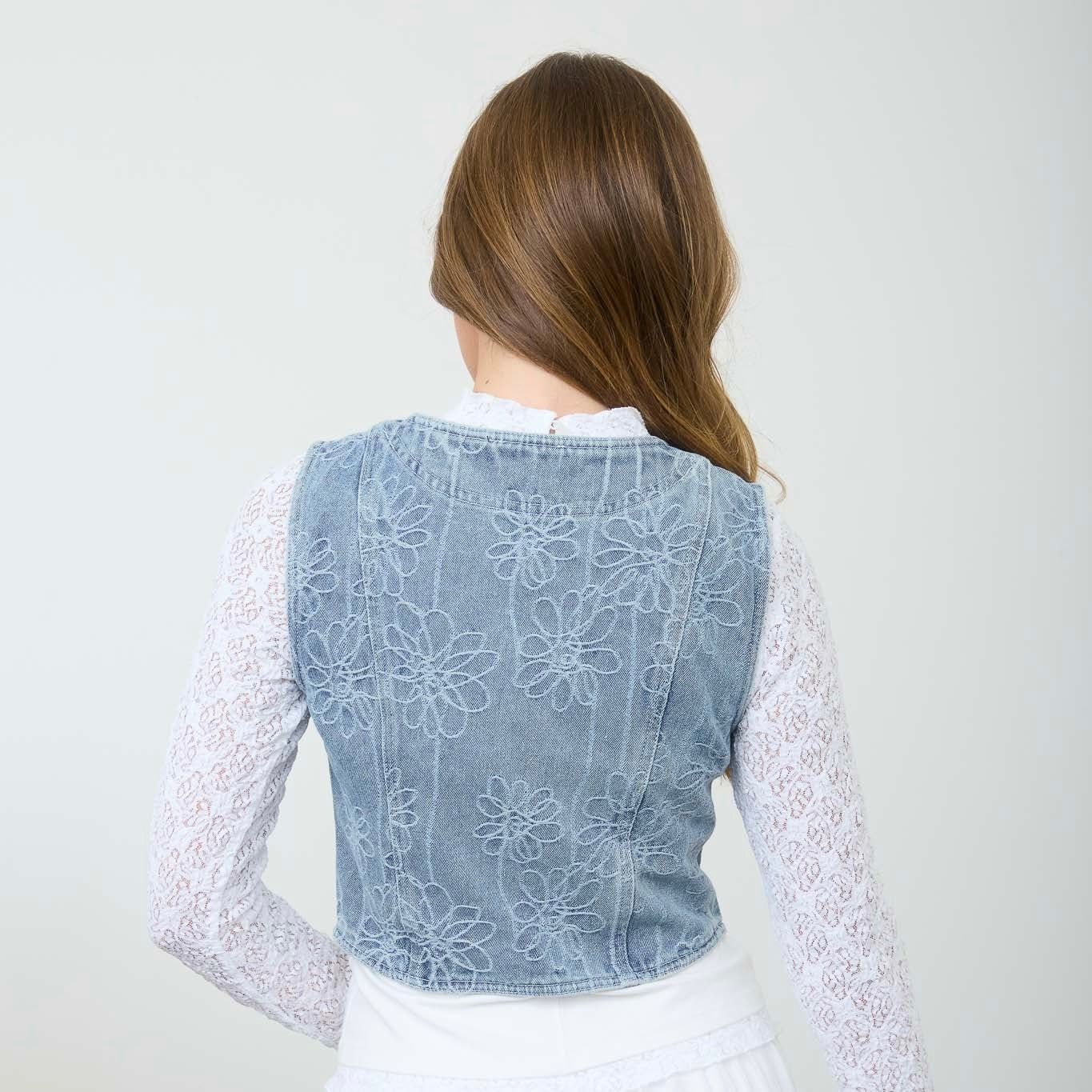 V NECKLINE SLEEVELESS CROPPED FRONT DOUBLE TIE DETAIL FLORAL WASHED DENIM PATTERN (TONES MAY VARY) NOT LINED DENIM VEST 75% COTTON 25% POLYESTER
