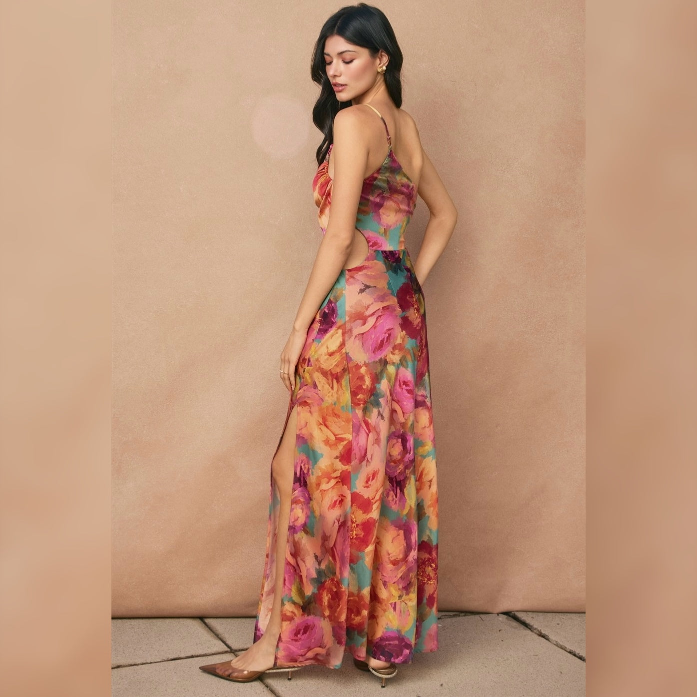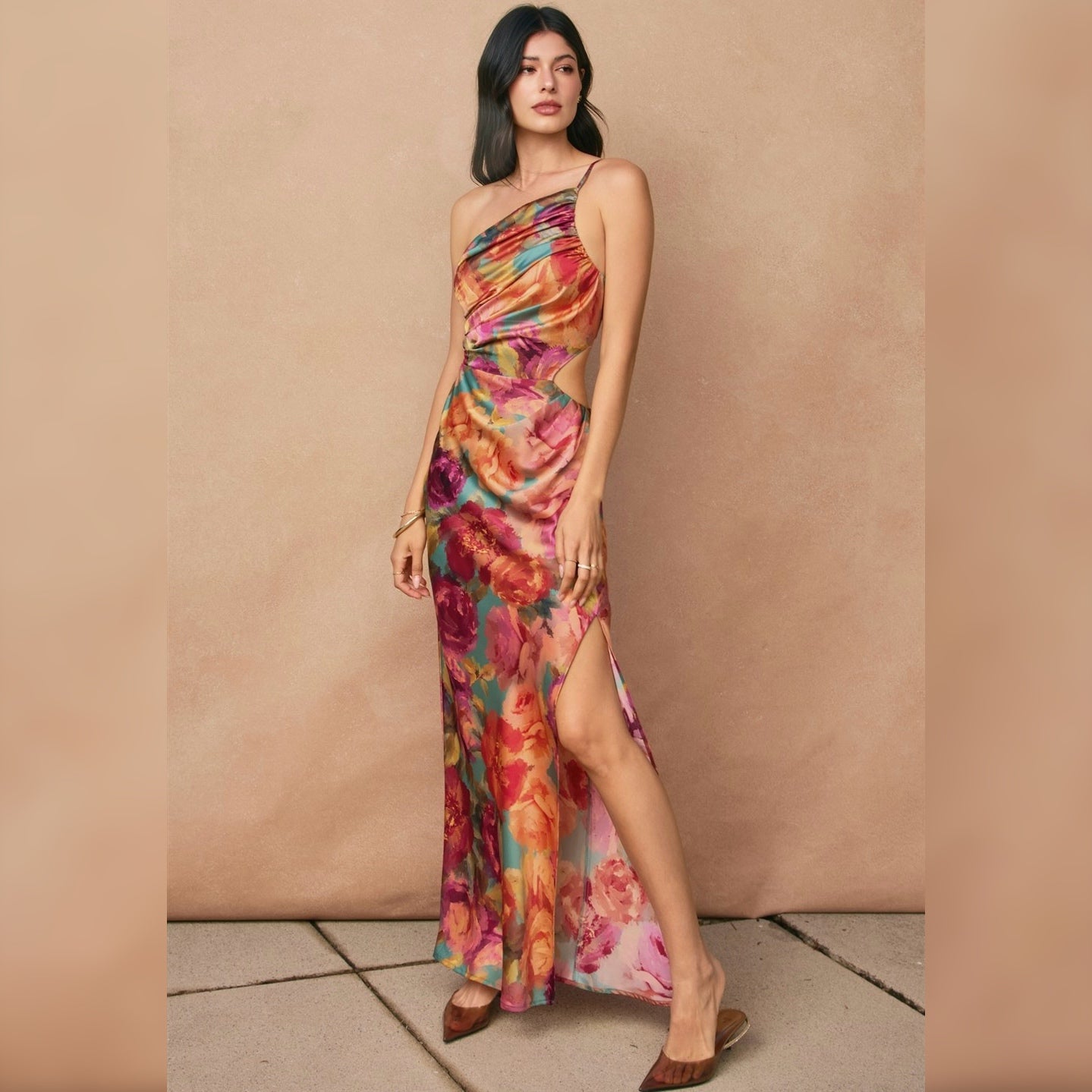 Floral print maxi dress featuring asymmetrical details. Models are 5'8" and wearing size Small. - One shoulder - Cutout side detail - Ruched bodice - High left side slit - Adjustable shoulder strap - Side zipper closure - Lined (top, short skirt) Shell: 100% Polyester Lining: 100% Polyester