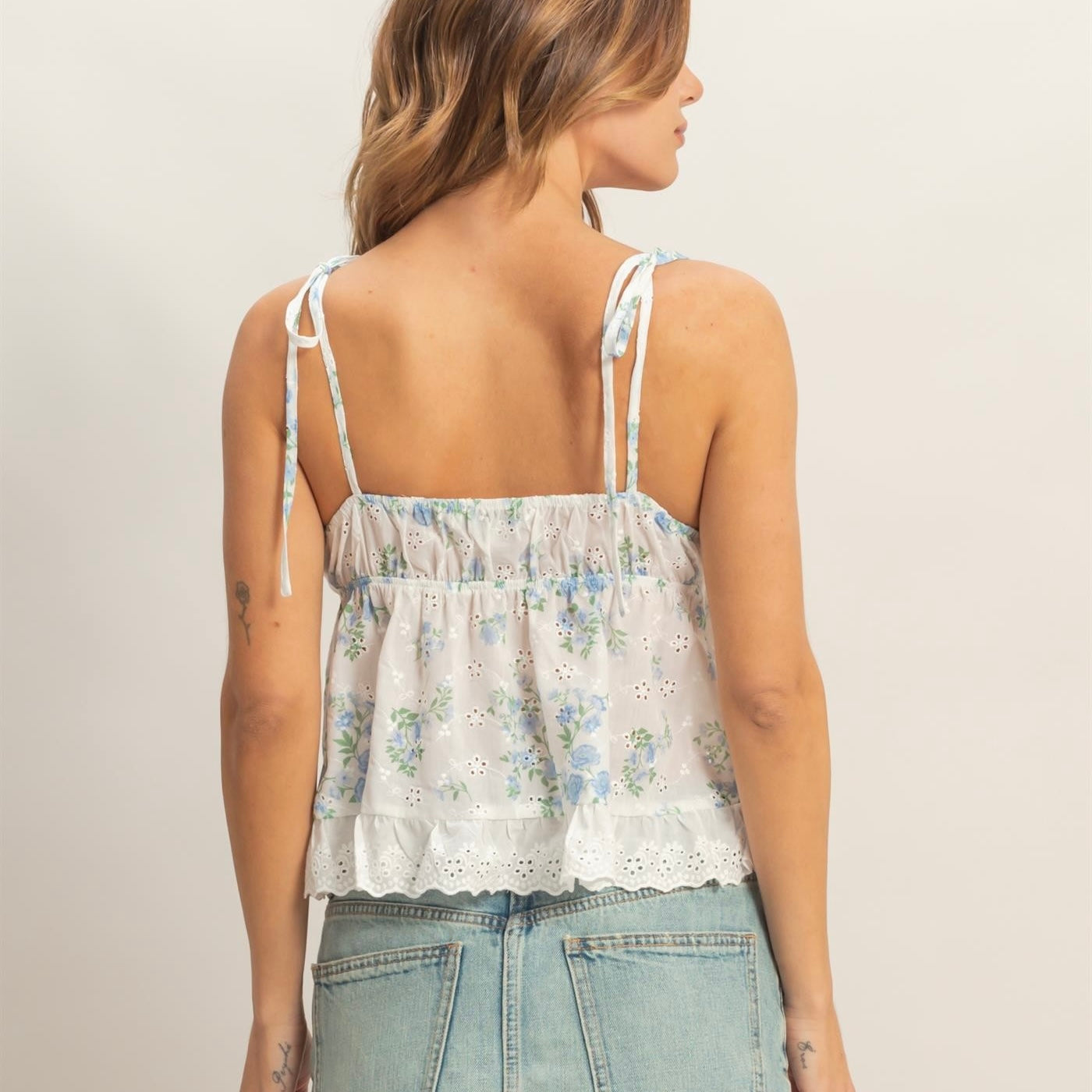 A floral camisole with adjustable straps and lace trim finish. Pair with distressed denim shorts for a breezy summer ensemble. Model Is 5' 8" Tall, 34" Chest, 26" Waist And 37" Hips And Wearing A Size Small Imported. Designed In The USA
