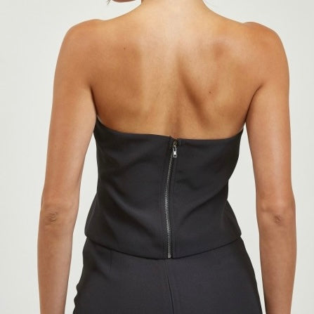 This strapless structured top redefines sleek sophistication with a minimal yet bold aesthetic. Crafted with a tailored silhouette, it features a modern straight neckline enhanced by a sculptural metallic accent at the center front. The fitted bodice contours the figure while maintaining a clean, architectural design that elevates any look. A concealed back zipper ensures a smooth finish and easy wear. - Strapless structured silhouette with clean straight neckline - Center-front metallic accent detail for modern edge - Tailored fit through the bodice with slight shaping at hem - Concealed back zipper for secure closure and sleek finish - Lightweight woven fabric with subtle structure for polished look - Designed to pair seamlessly with matching pants for a set