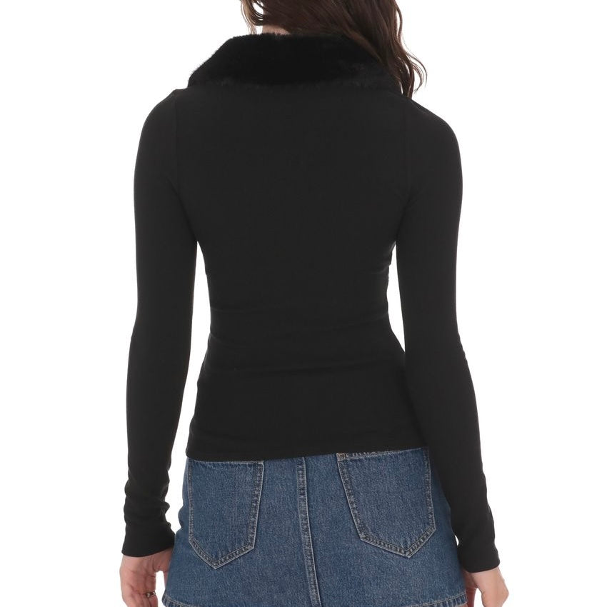 Fur Collar Zip-Up Cardigan in Black