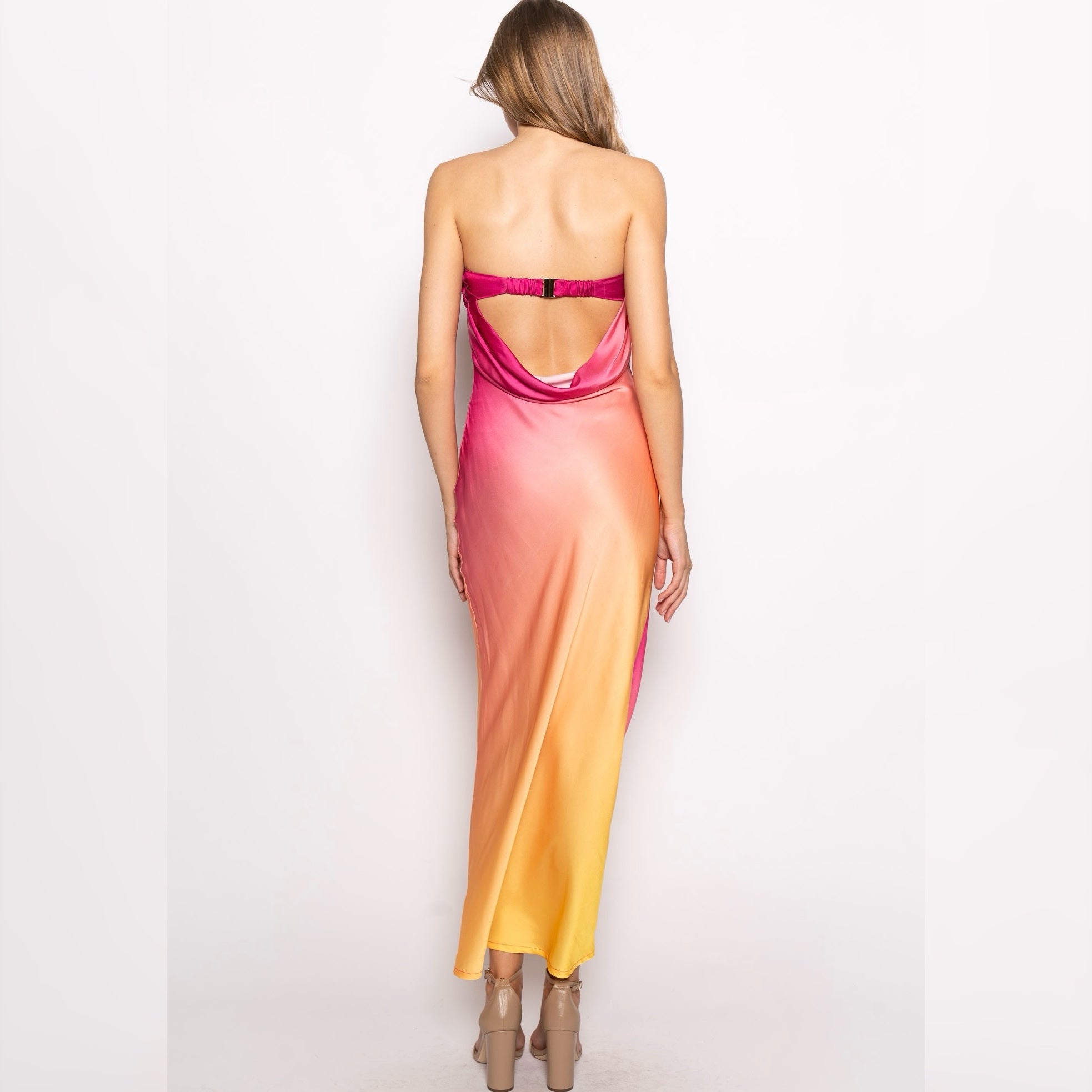STRAPLESS ELASTIC CLASP BACK MAXI DRESS TUBE STYLE ELASTIC STRAP CLASP CLOSURE OBRE COWL BACK MAXI LENGTH