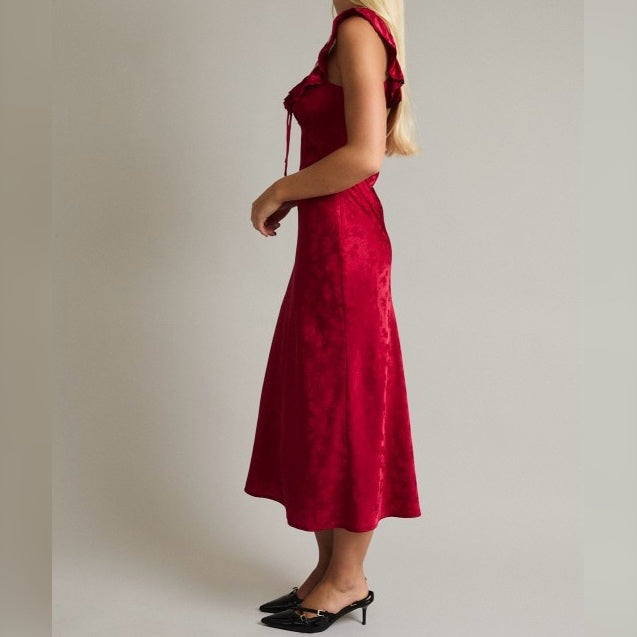 Sleeveless Square Neck Ruffle Lace Trim Midi Dress