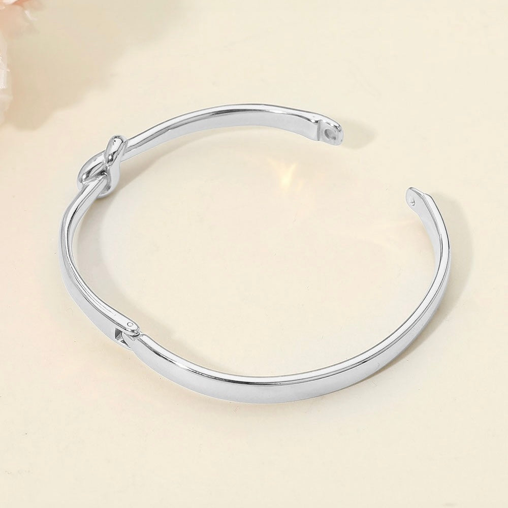 Size : 0.4" H, 2.3" D Hinged Closure Sleek hinged bangle bracelet designed with a refined knot accent for a timeless, minimalist statement. Features an easy open-and-close hinge for comfortable wear and a secure fit. Ideal for everyday styling, stacking with other bracelets, or elevating boutique jewelry collections with a clean, modern silhouette. Stainless Steel Stainless Steel Knot Hinged Bangle Bracelet