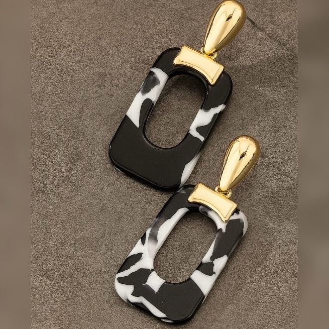 These chic Modern Tortoiseshell Drop Earrings blend contemporary style with timeless elegance. Crafted from lightweight resin, they feature a striking tortoiseshell pattern in tortoiseshell, black-and-white marbled, and creamy white hues. Each earring showcases a unique, open-center design with a gold-tone accent at the top, adding a touch of sophistication. Measuring approximately 1.75 inches in length, these hypoallergenic post earrings are perfect for elevating any outfit with a bold yet versatile statement.