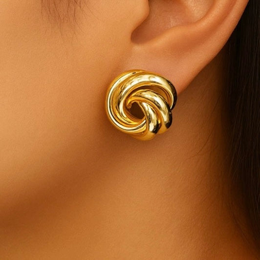 Size : 0.9" X 0.9" Post Back Chic knot stud earrings featuring a refined twisted design that symbolizes unity and elegance. Perfect for everyday wear or special occasions, these earrings bring a touch of sophistication and modern charm to any look. Brass Gold Dipped Hypoallergenic Lead and Nickel Compliant Made In Korea 14K Gold Dipped Love Knot Stud Earrings