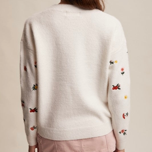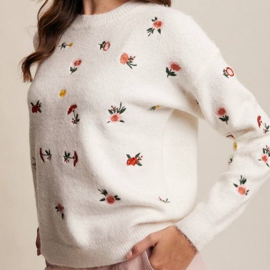 - Soft Touch: Cozy knit fabric with a fuzzy brushed texture - Delicate Detail: Allover multicolor floral embroidery on front and sleeves - Classic Fit: Crew neckline and relaxed silhouette - Ribbed Edges: Neck, cuffs, and hem finished with ribbed trim - Full Coverage: Medium weight for warmth without bulk - Model is 5' 7" 30-24-35 and wearing a size Small Whimsical and wearable, this floral-embroidered sweater brings a romantic twist to everyday layering.