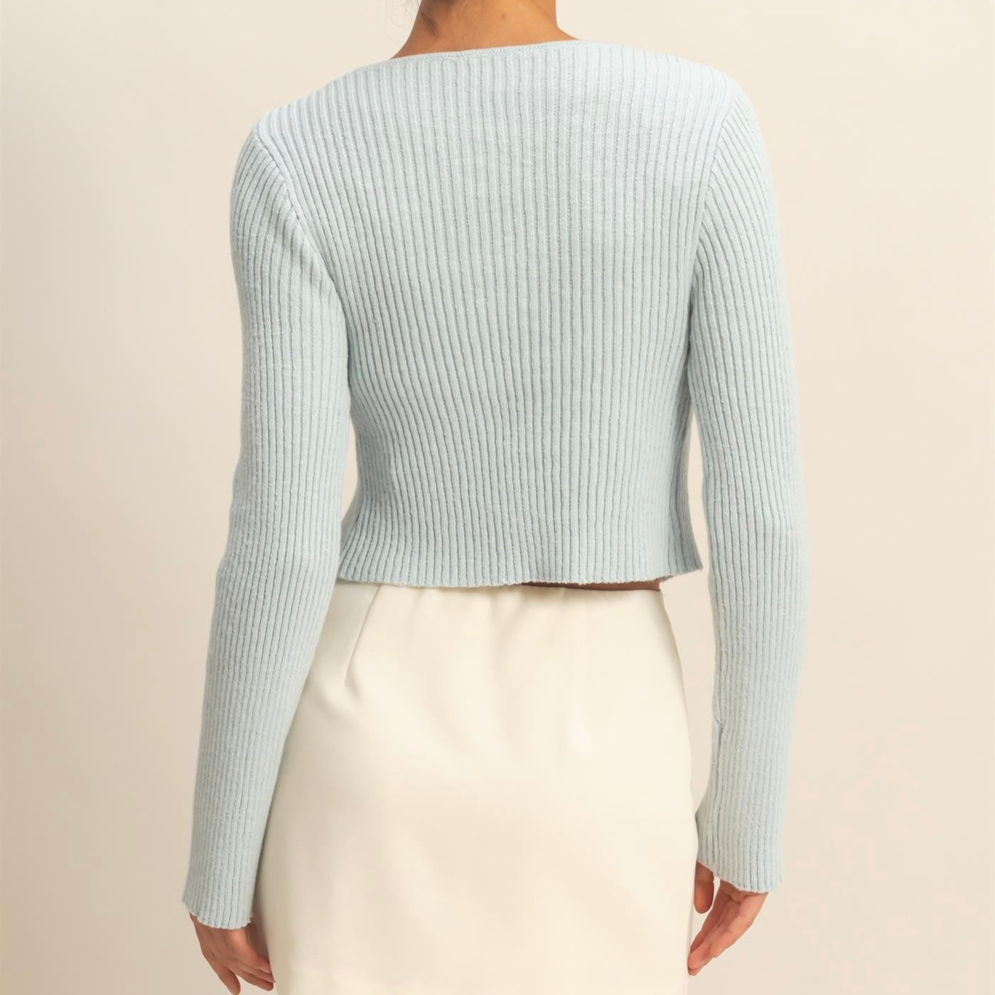 Effortlessly blending charm with a hint of playful allure, this ribbed cardigan features a deep V-neck that enhances its form-flattering silhouette. The adjustable drawstring front invites a customizable fit, perfect for layering over simple tops, while the elongated sleeves offer a cozy feel. It's an ideal choice for both casual outings and stylish evenings. Pair it with bold accessories for a striking look. Model Is 5' 7" Tall, 32" Chest, 25" Waist, 36" Hips And Wearing A Size Small Imported. Designed In The USA