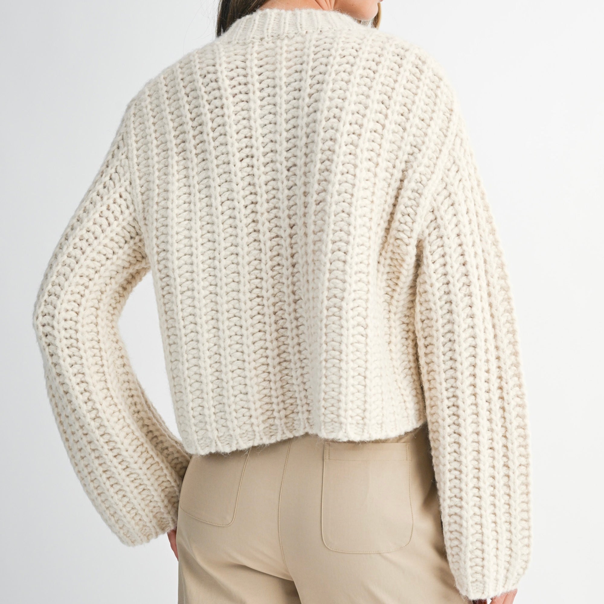 Chunky knit long sleeve large gold button down sweater cardigan. Front pocket detail.