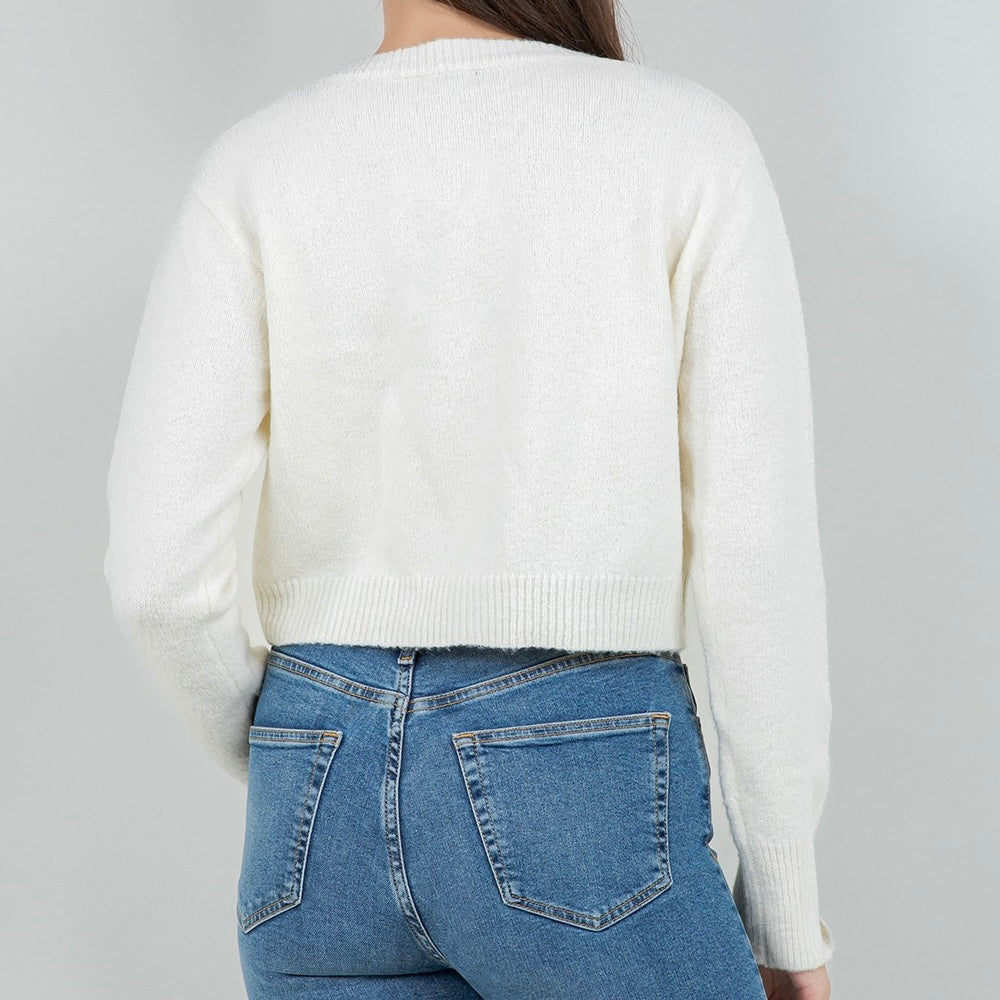 Playful cropped cardigan adorned with embroidered strawberries and flowers down the front. Features a crew neckline, front button closure, and soft knit texture. Model is wearing size S/M Height: 5' 8" Measurements: 32B-25-36